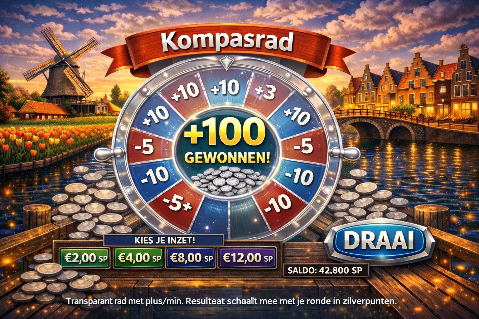 Open TulpengloedEen rad met zichtbare segmenten — geen verborgen regels. Jij kiest je ronde, het kompas draait, en je ziet direct wat er gebeurt (plus of min).